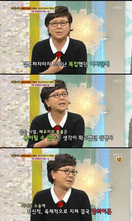 특히 김형자는 "그때 변호사가 절대적으로 내가 유리하다더라. 그런데 소송기간이 너무 길었다. 거의 감옥 생활이었다"며 "남자와 잠깐이라도 커피숍에 못 들어갔다. 책이 잡히기 때문이었다. 거의 감옥생활이었다. 결국 내가 너무 지쳐 합의이혼 제안을 먼저 꺼냈다. 그쪽에서는 바로 수락하더라"고 말해 안타까움을 자아냈다.