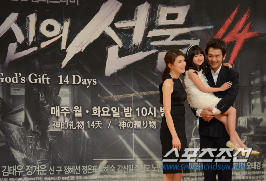27일 오후 서울 양천구 목동 SBS에서 드라마 '신의 선물-14일' 제작발표회가 열렸다. 이보영, 아역배우 김유빈, 김태우가 포토타임에서 포즈를 취하고 있다.