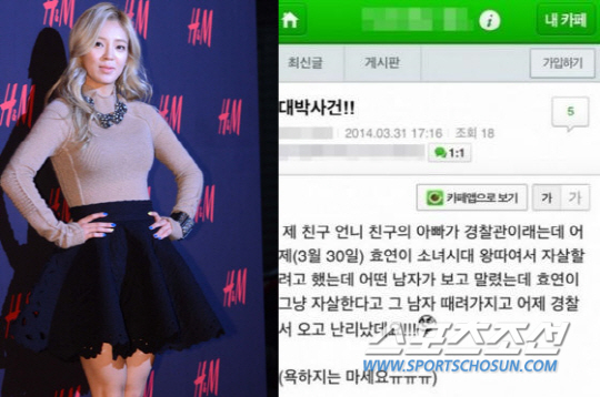 게시글에는 "제 친구 언니 친구의 아빠가 경찰관인데 어제(3월30일) 효연이 소녀시대 왕따여서 자살하려 했는데 어떤 남자가 보고 말렸는데 효연이 그냥 자살한다고 그 남자 때려서 어제 경찰 오고 난리 났대요"라는 내용이 담겨있다.