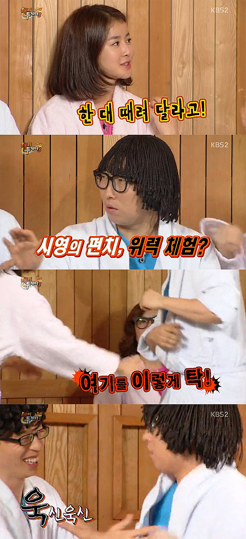 이시영 앞에 선 박명수는 떨리는 목소리로 "어떻게 칠 거냐"고 물었고, 이시영은 "상대방의 펀치를 피하면서 배를 치는 거다"라며 손바닥으로 박명수의 옆구리를 가격했다.