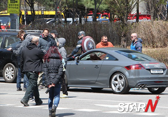 배우 크리스 에반스가 영화 '어벤져스:에이지 오브 울트론'(어벤져스2)의 상암 촬영 현장에 등장했다.