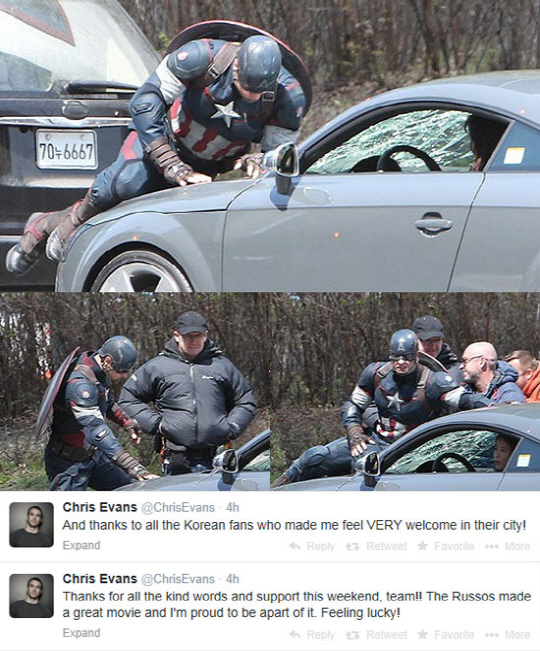 크리스 에반스는 이날 오전 서울 마포구 상암동 DMC 월드컵북로에서 첫 촬영을 마쳤다. 11시께 모습을 드러낸 크리스 에반스는 캡틴 아메리카 수트를 입고 등장해 많은 취재진들의 플래시세례를 받았다. 그는 촬영 스태프 및 대역배우와 합을 맞추거나 촬영에 대해 논의하는 등의 적극적인 모습을 보이며, 보닛 위에서 점프하고 구르는 다양한 액션 장면을 보일 때 마다 현장을 찾은 수많은 시민들의 환호성이 터져 나왔다.