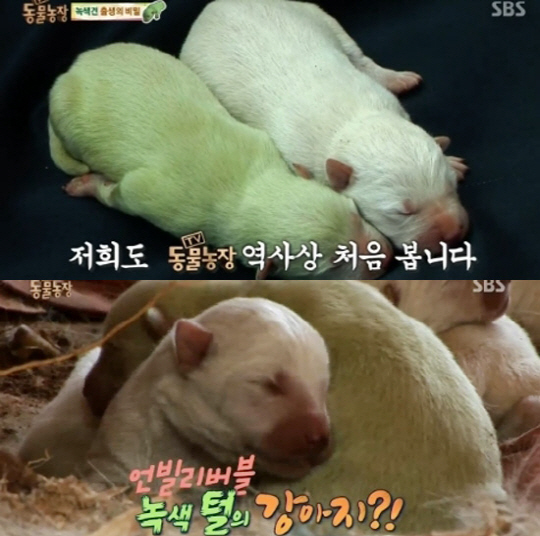 12일 방송된 SBS 'TV 동물농장'에서는 백구 가문에 태어난 녹색 강아지 녹돌이의 모습이 그려졌다.
