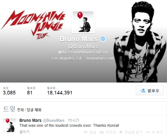 브루노 마스는 공연 직후 자신의 트위터 계정을 통해 "That was one of the loudest crowds ever. Thanks Korea!(역대 가장 큰 함성 소리를 내준 관중들이었다. 고마워요 한국!)"이라는 글을 게재했다.