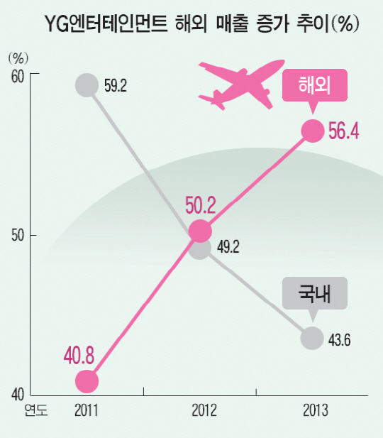 2013년 말 기준으로 YG 전체 매출에서 해외가 차지하는 의존도는 56.4%. 상당히 높은 편인데, 이마저도 계속적인 상승 추이를 보이고 있다. 2011년 40.8%, 2012년 50.2%를 기록했으며, 올 한해는 더욱 높아질 전망이다. 이는 싸이의 글로벌 앨범 발매와 2NE1의 월드투어공연, 빅뱅의 새 앨범 출시 및 이에 따른 해외공연 등이 잡혀있기 때문이다.