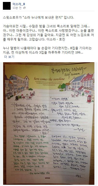 '봄 앨범 녹음중인 스윗소로우가 소라 누나에게'란 제목의 이 편지에서 멤버들은 각자의 추억을 담아 이소라 음악을 소개했다.