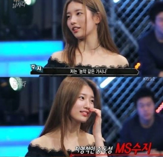 이에 수지는 "'농약 같은 가시나'라는 닉네임이 제일 마음에 든다"라며 웃어 보였다. 그러자 MC 임원희는 "센 것을 좋아하는 구나"라고 맞장구 쳐 웃음을 자아냈다.