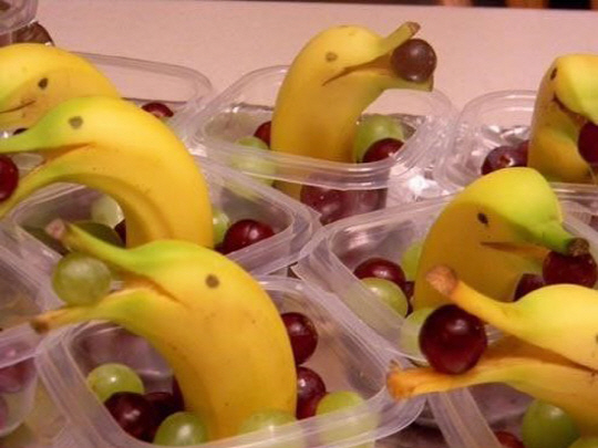 사진에는 노란색 돌고래로 변신한 바나나가 포도를 물고 있는 귀여운 모습이 담겨 있다. 바나나의 꼭지를 입으로 만들고, 검은색 펜으로 눈을 그려 깜찍한 돌고래 비주얼을 완성해 눈길을 끈다.