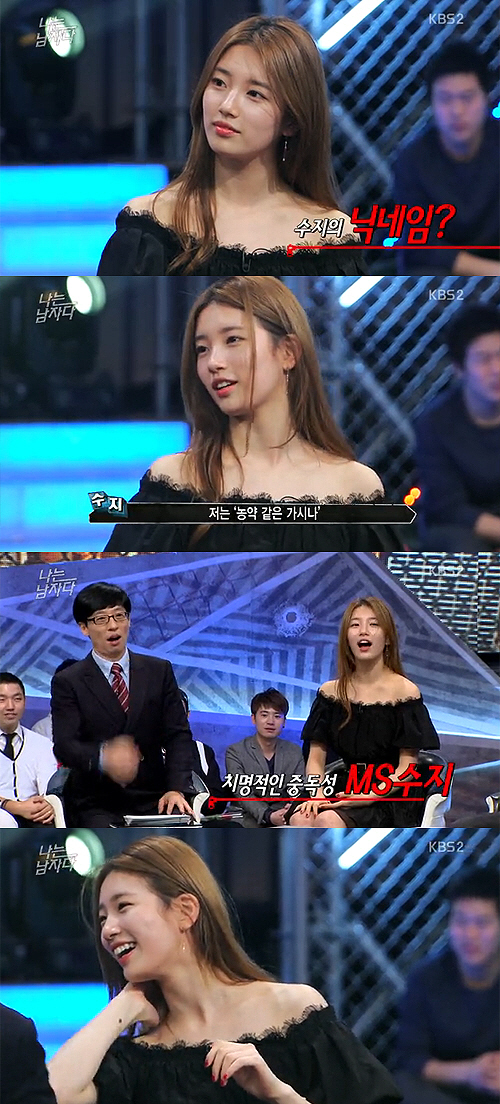 또 이날 한 남자 방청객은 수지의 새로운 닉네임으로 화학조미료(MSG)처럼 중독성 있다는 뜻에서 'MS 수지'를 추천했고, 또 다른 남자 방청객은 '내꺼'라고 외쳐 폭소케 했다.