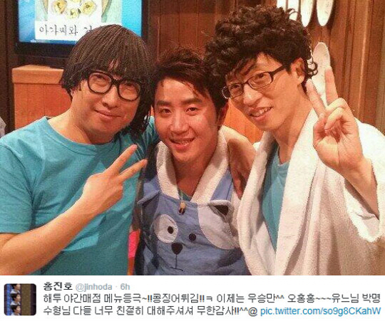 홍진호는 11일 자신의 트위터에 "해투 야간매점 메뉴등극! 콩징어 튀김! 이제는 우승만"이라며 "유느님 박명수 형님 다들 너무 친절히 대해주셔서 무한감사!!"라는 글과 함께 유재석,박명수와 함께 찍은 사진을 게재했다. 사진에는 홍진호를 사이에 두고 유재석과 박명수가 브이를 그리며 다정한 모습을 보이고 있다.