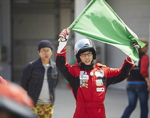 공개된 사진에는 빨간색 점핑슈트를 입은 유재석이 검은색 헬멧을 쓰고 초록색 깃발을 힘차게 흔드는 모습이 담겨 있다.