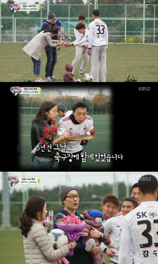 이후 쌍둥이 아이들과 축구장에서 함께 하고 있던 문정원에는 강수일 선수가 뛰어와 "축하드립니다. 행복하세요"고 말하며 장미 꽃송이를 건넸다.