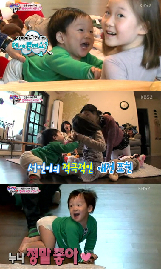 그러나 이후에도 서언이는 별이의 머리를 잡아당기는 등 적극적인 애정표현을 멈추지 않았다. 이내 당황한 별이가 도망을 가자 서언이는 성큼성큼 별이에게 다가갔고, 결국 별이는 서언이를 피해 쇼파 위로 올라갔지만 서언이는 별이를 쫓아 자신의 키만한 소파에 올라가기 위해 애를 쓰는 등 부전자전 모습을 선보여 시청자들을 폭소케 했다.