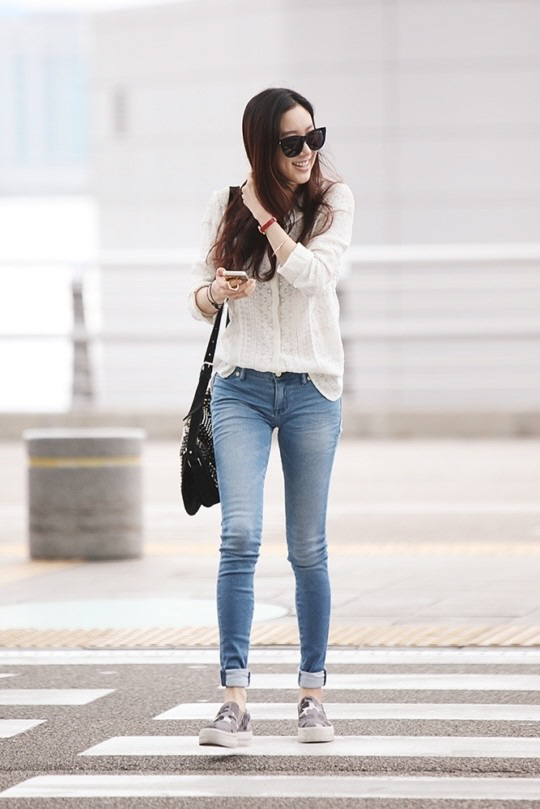 이날 정려원은 레이스 패턴이 독특한 화이트 블라우스에 데님 팬츠를 입고 나타났다. 자연스러운 헤어스타일로 청순한 매력을 뽐낸 정려원은 늘씬한 각선미가 돋보이는 스키니진을 롤업하고 슬립온 슈즈를 매치해 편안한 스타일을 연출했다.