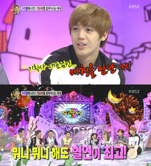 14일 방송된 KBS2 '안녕하세요'에서는 9개월 간 60번 가요제에 출전한 걸그룹 지망생 유부녀의 사연이 공개됐다. 이에 엠블랙 지오는 "나도 가요제에 많이 나갔었다. 창원 D 백화점 가요제, 도 대회에도 나갔었다. 도 대회에서는 3위했고 시 대회는 보통 다 1등했다"며 "미르는 가수가 되기 위해 기획사 대표인 매형을 만났다"고 폭로했다. 미르는 "큰 누나가 노력 많이 해줬다"며 "누나, 결혼해줘서 고마워"라고 영상편지를 보내 웃음을 안겼다. 포미닛 현아는 "데뷔 전 동대문 무대에서 경험을 쌓다 캐스팅 됐다"고 전했다.