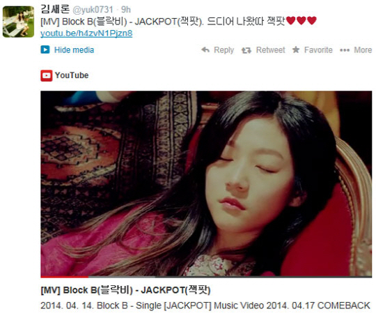 김새론은 15일 자신의 트위터에 "[MV] Block B(블락비) - JACKPOT(잭팟). 드디어 나왔다 잭팟"이라는 글과 함께 블락비의 '잭팟' 뮤직비디오 링크를 게재했다.