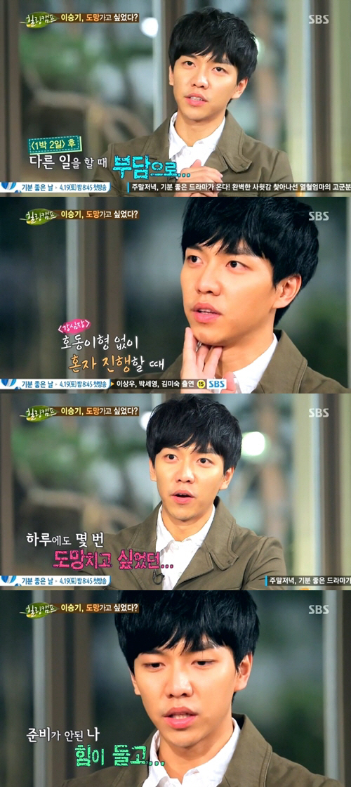 이날 이승기는 강호동의 갑작스러운 하차로 예능 프로그램 '강심장' 단독 MC를 맡았던 과거를 회상하며 "너무 힘들어서 하루에도 몇 번이나 도망치고 싶었다"고 털어놨다.