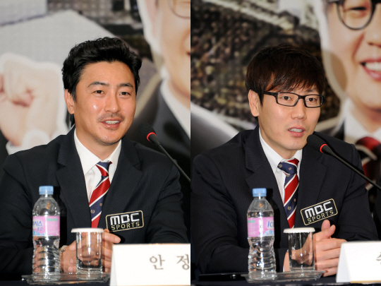 대한민국 축구 국가대표팀에서 한솥밥을 먹으며 2002년 월드컵 4강 신화를 합작한 안정환과 송종국. 2014 브라질월드컵에서 MBC 중계석에 앉는 두 사람은 메인 해설위원 자리를 놓고 선의의 경쟁을 펼친다. 15일 제주 서귀포시 롯데호텔에서 열린 MBC 월드컵 중계단 기자회견에서 안정환과 송종국은 입담으로 전초전을 치렀다. 현역 선수 시절의 축구 실력 못지않은 국가대표급 입담이었다.