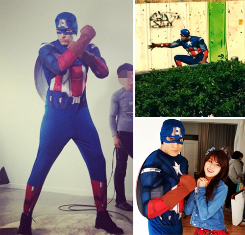 공개한 사진에는 영화 '캡틴 아메리카' 속 크리스 에반스가 입은 캡틴 아메리카 수트를 입고 포즈를 뽐내고 있다.