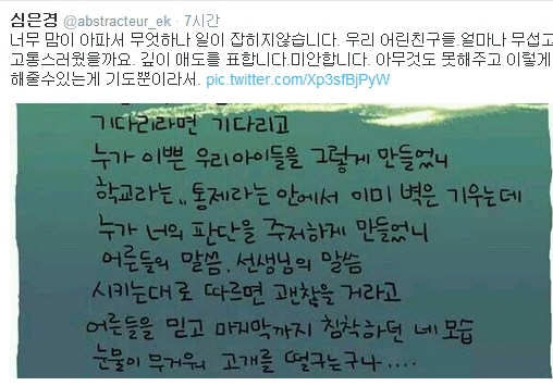 이와 함께 심은경은 '조남준의 발그림'을 함께 첨부했다. '조남준의 발그림'에는 "착한 바보들아, 항상 시키는 대로 따르기만 했던 착한 아이들아. 가만히 있으라면 가만히 있고 기다리라면 기다리고, 누가 예쁜 우리 아이들을 그렇게 만들었니"라는 내용이 담겨 있어 보는 이들의 마음을 아프게 했다.