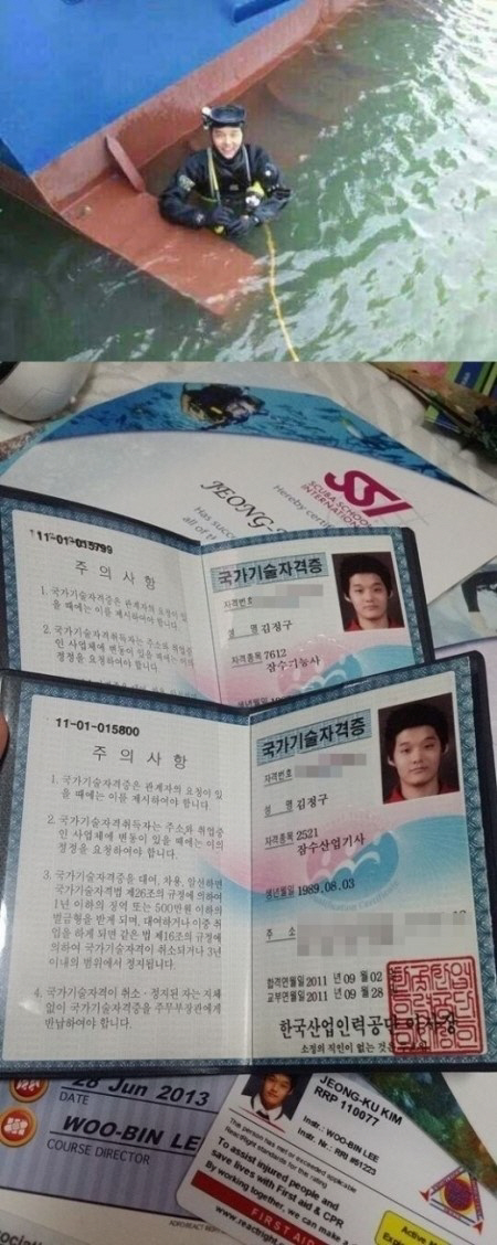 김정구는 한국폴리텍3대학 강릉캠퍼스 산업잠수과 출신으로 잠수산업기사, 잠수기능사 등 여러 잠수 관련 자격증을 소지하고 있는 것으로 알려졌다.