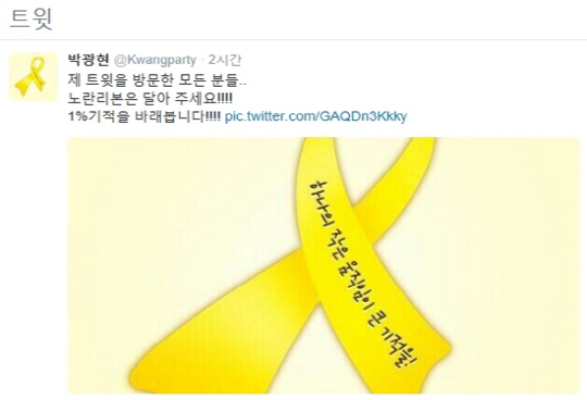 박광현은 22일 자신의 트위터 계정을 통해 "제 트윗을 방문한 모든 분들. 노란리본을 달아 주세요. 1%의 기적을 바라본다"라는 글과 함께 노란리본 캠페인 사진을 게재했다.