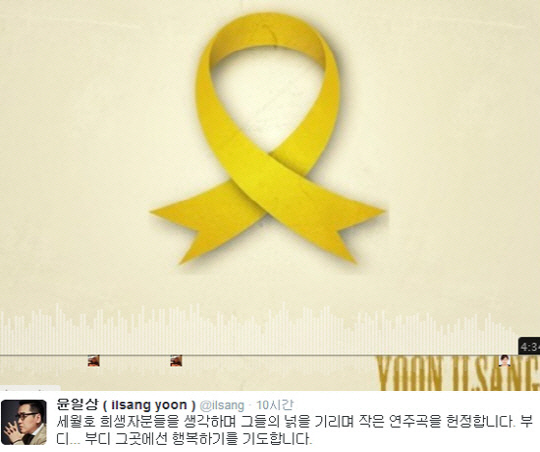 또한 앞서 윤일상은 세월호 침몰 사고와 관련해 자신의 생각을 트위터를 통해 공개하기도 했다. 그는 "실종된 아이들에게 이 시대를 살아가는 한 사람으로서 참으로 미안하다. 누구를 욕하기 전에 '내 자신은 이 모든 것에 온전히 떳떳한가?'를 생각하게 된다"며, "부끄럽지 않은 어른이 되도록 노력하고 노력해야지 참 많은 깨달음을 준다"는 글을 올리며 실종자들의 무사귀환을 기도했다.