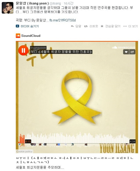 23일 윤일상은 자신의 트위터 계정을 통해 "세월호 희생자분들을 생각하며 그들의 넋을 기리며 작은 연주곡을 헌정한다"며 "부디…부디 그곳에선 행복하길 기도합니다"고 글과 함께 헌정곡을 공개했다.