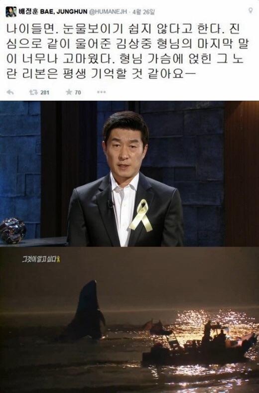 배 PD는 지난 26일 방송 직후 자신의 트위터 계정을 통해 "나이가 들면 눈물 보이기 쉽지 않다고 한다"며 "진심으로 같이 울어준 김상중 형님의 마지막 말이 너무나 고마웠다. 형님 가슴에 얹힌 그 노란 리본은 평생 기억될 것"이라는 글을 게재했다.