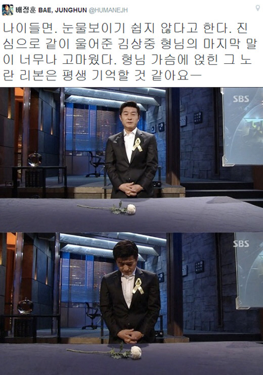 지난 26일 배정훈 PD는 자신의 트위터를 통해 "나이 들면 눈물 보이기 쉽지 않다고 한다. 진심으로 같이 울어준 김상중 형님의 마지막 말이 너무나 고마웠다"며 "형님 가슴에 얹힌 그 노란 리본은 평생 기억할 것 같아요"라며 김상중을 향한 감사의 마음을 드러냈다.