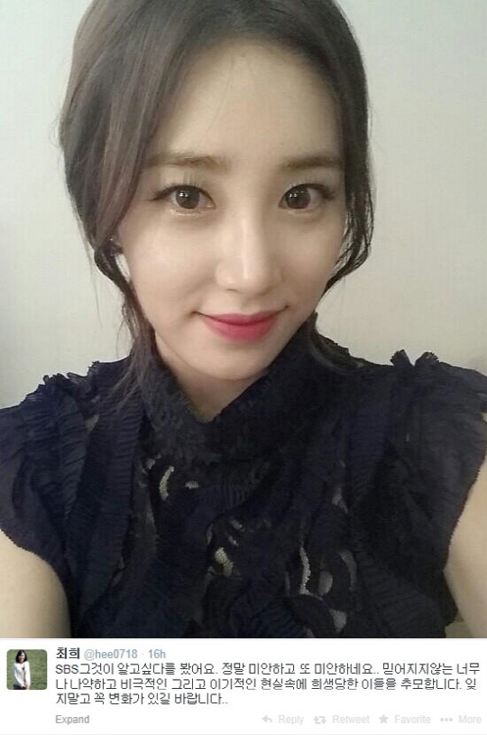 최희는 27일 자신의 트위터를 통해 "SBS '그것이 알고 싶다'를 봤어요. 정말 미안하고 또 미안하네요. 믿어지지 않는 너무나 나약하고 비극적인 그리고 이기적인 현실 속에 희생당한 이들을 추모합니다. 잊지 말고 꼭 변화가 있길 바랍니다"라는 글을 게재했다.