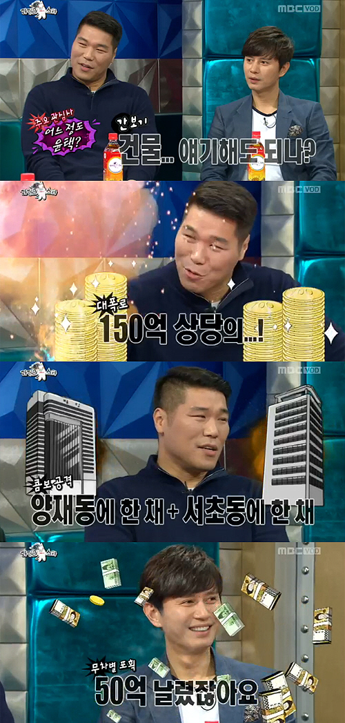 그러자 김구라는 "이미 보도된 거다. 내가 특종 터뜨린 거 아니지 않냐. 액수도 보도됐다"며 "정정하겠다. 양재동에 한 채, 서초동에 한 채 있다"며 끝까지 폭로해 웃음을 자아냈다.