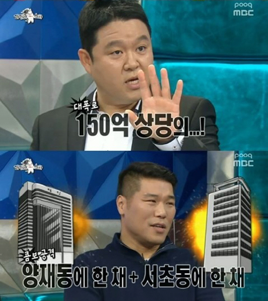 하지만 MC 김구라는 "내가 특종 터뜨린 것도 아니지 않느냐 이미 보도된 거다"라며 "양재동에 한 채, 서초동에 한 채 있다"라고 설명해 눈길을 끌었다.