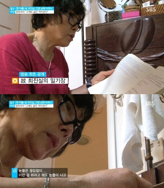 이날 정옥숙 씨는 최진실의 물건을 꺼내놓으며 딸과의 추억을 회상했다. 이에 딸의 글씨로 쓰인 일기장을 발견한 어머니는 자신도 한 번도 본 적이 없는 것이라며 읽어 내려갔다.
