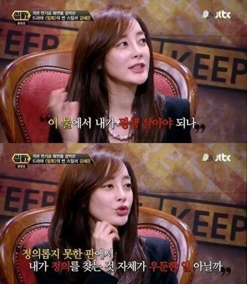 또한 "정의롭지 못한 판에서 정의를 찾는 게 우둔한 일이라고 생각했다"는 그녀는 "내가 연기와 방송을 좋아하는 건 보고 판단해 줄 수 있는 시청자와 관객이 있기 때문이다"라고 덧붙였다.