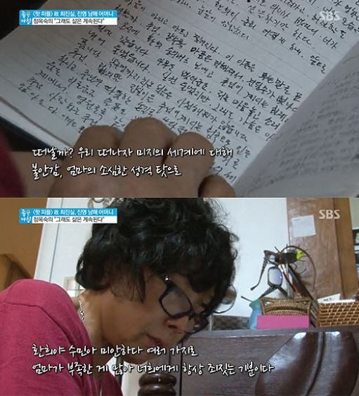 정옥숙 씨는 "보면 이렇게, 항상 마지막이라고 생각하고 절망적으로 써놨다. 만날 혼자 있으면 커튼을 깜깜하게 해놓고 나보고 방에서 나가라고 했다. 이렇게 안 울려고 해도 눈물이 끊임없이 나온다"며 하염없이 눈물을 흘렸다.