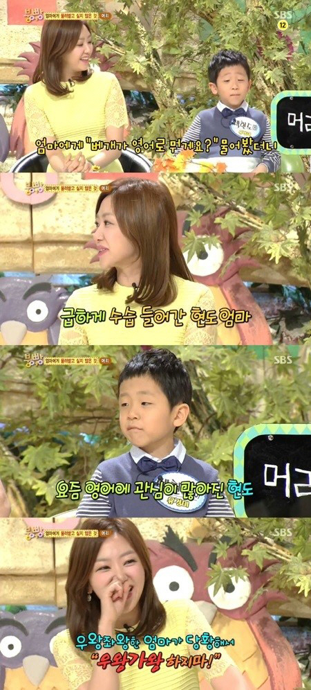 박현도 군은 "엄마에게 베개를 뜻하는 영어 단어를 물어봤더니 '쿠션'이라고 답했다"며 "또 주유소는 영어로 '오일 뱅크'라고 하더라. 주유소는 가스 스테이션(gas station)이다"고 말해 유경미를 당황하게 했다.