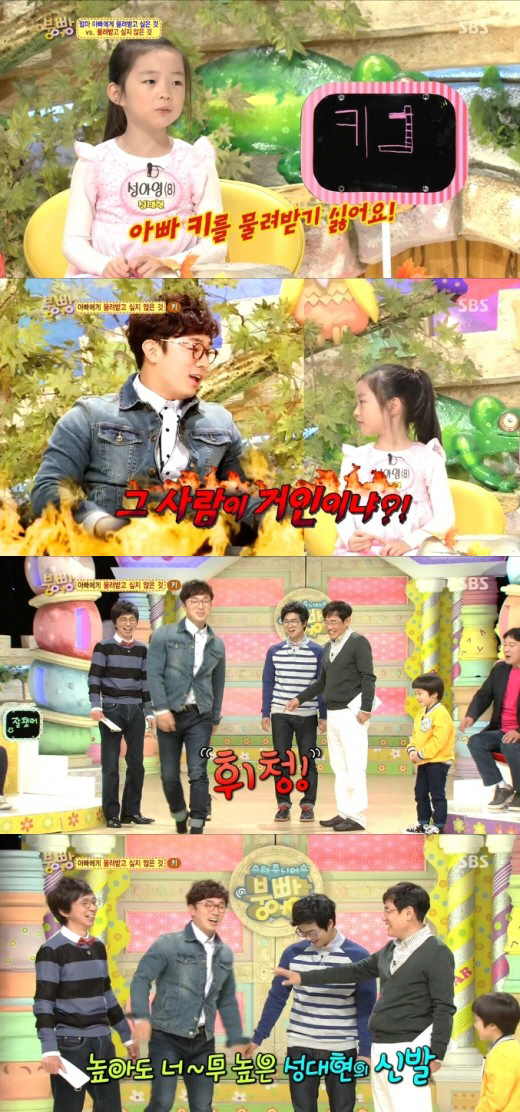프로필상 키가 174cm인 성대현은 딸의 이 같은 발언에 키 169cm라는 홍인규와 키를 재기 위해 신발을 벗자, 급격히 작아지는 키를 보여 놀라움을 안겼다. 이에 이경규는 "167cm 정도 되겠다"고 콕집어 말했고, 성대현은 "딱 맞았다"고 고백해 또 한번의 웃음을 안겼다.
