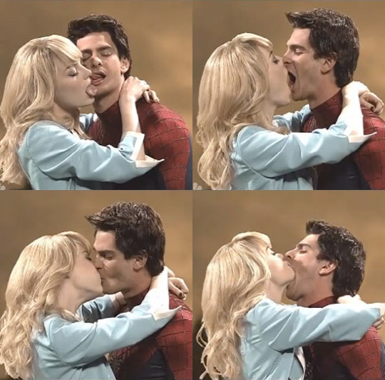 특히 엠마 스톤과 앤드류 가필드는 공개 열애 중인 커플답게 과감하면서도 재미있는 키스신으로 시청자들에게 재미를 안겼다. 서로의 혀로 입술 부근을 핥는가 하면, 한 껏 입을 벌리는 키스와 입 속에 공기를 불어 넣는 모습 등 다양한 키스신을 연출했지만 감독의 OK 사인을 받는데 실패했다.