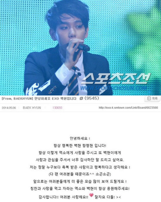 6일 백현은 '엑소-K' 공식 홈페이지를 통해 "안녕하세요. 항상 행복한 백현 '항행현' 입니다. 항상 이렇게 엑소에게 사랑을 주시고 또 백현이에게 사랑과 관심을 주셔서 너무 감사하단 말 드리고 싶어요"라며, "저는 정말 누구보다 축복 받은 사람이고 행복하다고 생각해요. 다 팬 여러분들 덕분이죠. 앞으로는 여러분들에게 더 좋은 모습 많이 보여 드릴게요. 칭찬과 사랑을 먹고 자라는 엑소와 백현 항상 응원해주세요"라는 감사 인사를 전달했다.