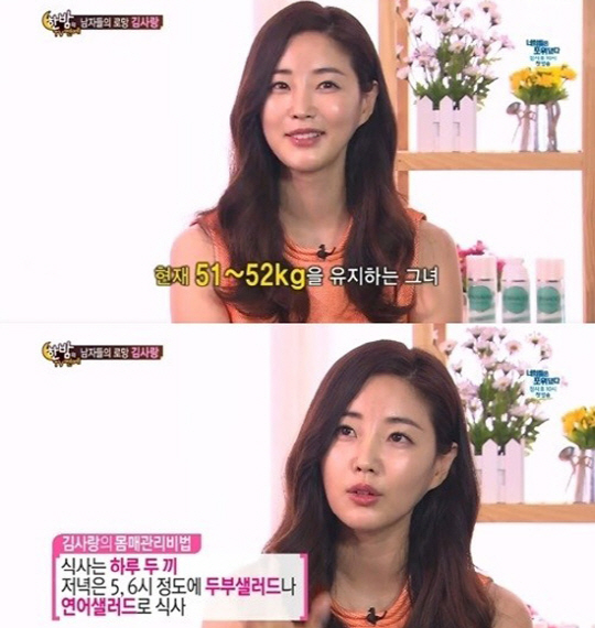 김사랑은 포털사이트 프로필의 '173cm, 49kg'라고 나온 것에 대해 "미스코리아 때 몸무게다. 그 다음해부터 좀 불었다. 현재 51kg~52kg 왔다 갔다 한다"고 밝혔다.