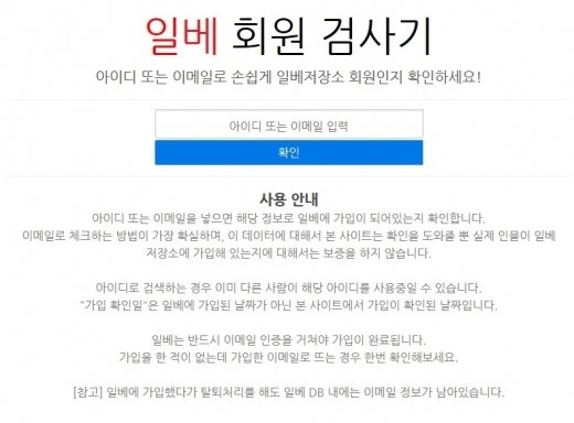 일베 회원 검사기 홈페이지에 접속 후 아이디 또는 이메일 주소를 입력하면 그 사람이 '일베' 회원인지 아닌지를 확인할 수 있다.
