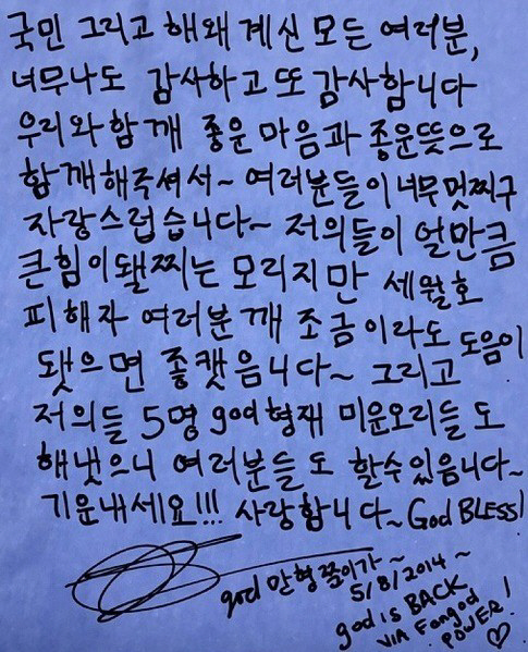또 "저희들 5명 god 형제 미운오리들도 해냈으니 여러분들도 할 수 있습니다. 기운내세요. 사랑합니다. God Bless"라고 덧붙였다.