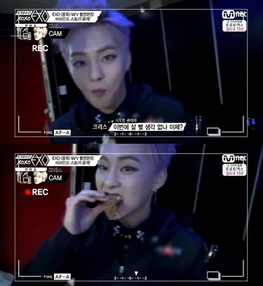 이날 뮤직비디오 현장에서 멤버 크리스는 직접 카메라를 들고 멤버들의 모습을 담았다. 마침 모카빵을 먹는 시우민을 발견한 크리스는 "뭐하고 있냐"고 물었다.