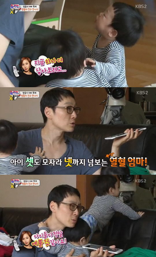 이날 이휘재는 자신과 마찬가지로 쌍둥이를 키우고 있는 슈에게 전화를 걸어 "요정이 이슬만 먹고 살아야지 어떻게 아이를 셋이나 낳았어?"라고 인사를 건넸다.