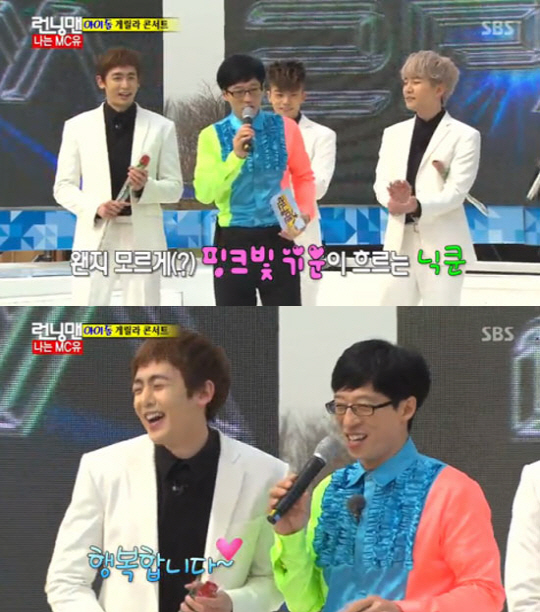 이어 유재석은 "태국을 갔을 때 잘 되어서 좋다. 우리도 잘 되고 본인도 잘 돼서 참 좋다. 언제부터 만난거에요?"라며 열애 중인 사실을 집요하게 언급했고, 때마침 소녀시대 유닛 크룹 '태티서'의 '트윙클' 노래가 흘러나오자 닉쿤은 "행복합니다"라며 웃음을 지어보였다.