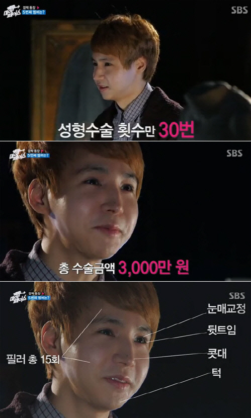 이후 신성훈은 제작진과의 인터뷰에서 "턱, 눈매 교정, 뒷트임, 콧등, 콧대 등 성형 수술 횟수만 30번이 넘는 것 같다"며 "금액으로 따지면 3천만 원 정도 된다"고 밝혀 놀라움을 자아냈다.