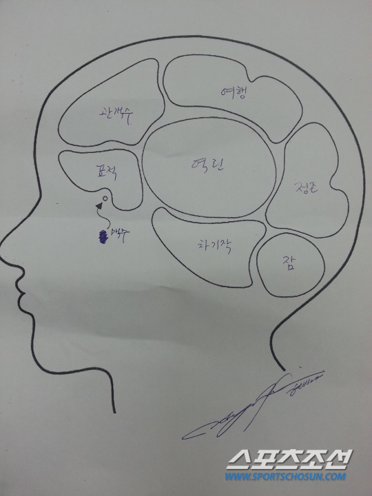 현빈은 무슨 생각을 하고 살까. 인터뷰와 별도로 현빈에게 본인의 뇌구조를 그려주길 부탁했다. 뇌구조를 다 그리고 난 뒤, 빵 터졌다. '역린', '관객수', '정조'까지 죄다 영화 이야기다. 그리곤 '여행'과 '잠'이 고프다고. 눈에 띄는 부분은 경쟁작인 '표적'. 현빈은 "하하. '표적', 두 영화 다 잘됐으면"이라며 웃었다. 참고로 '맥주'라고 쓴 부분은 사실 '등 근육'이었으나, 현빈이 "다들 등 이야기 뿐이다. 빼야겠다"라며 '맥주'로 바뀌었다. 마지막으로 팬은 뇌가 아닌 가슴에 있다고 전해달란다. 꼭~