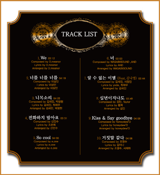 이 외에도 '미씽유(missing you)'로 호흡을 맞췄던 박창현 작곡가와 함께 작업한 '니목소리', '가슴 아파도'를 함께 한 신인수 작곡가의 '전화하지 말아요', 조영수 작곡가와 김이나 작사가가 함께 한 '거짓말 같다'와 플투 8집 앨범에도 참여해 화제가 된 가수 정엽이 이번 앨범에도 참여해 과연 어떤 스타일의 곡인지 팬들의 기대감을 높이고 있다.