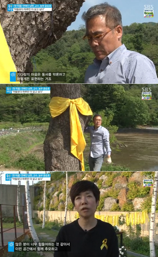 이날 윤승호 교수와 김미화는 세월호 참사를 애도하고 실종자를 기다리는 마음으로 노란리본달기 캠페인 행사를 준비했다. 거대한 노란리본을 힘겹게 나무에 묶은 윤승호 교수는 "기다림의 마음은 동서양 같은 거다. 꼭 돌아오면 좋겠다"고 말했다.